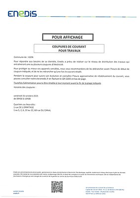 Veuillez noter qu'une coupure de courant est prévue le 31 octobre 2025, rue de l'Ermitage et rue du Canal de 9h00 à 13h00. (ref/note ci-joint)