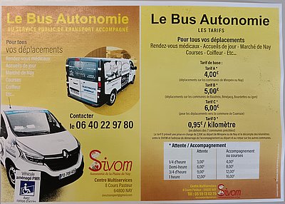 Le service du SIVOM d'aide au transport à la demande, est destiné notamment aux Igonais qui souhaitent se déplacer, aussi bien pour faire ses courses, aller au marché de Nay, se rendre chez son médecin, son coiffeur, rendre visite à quelqu'un... Le...