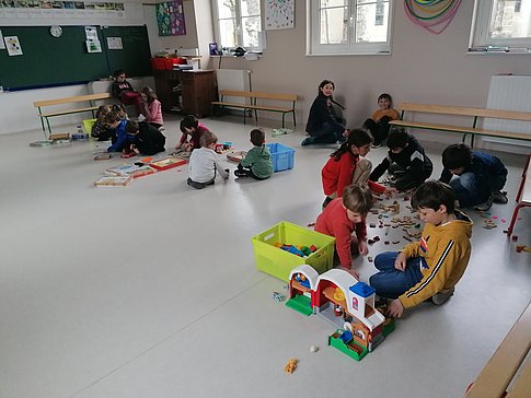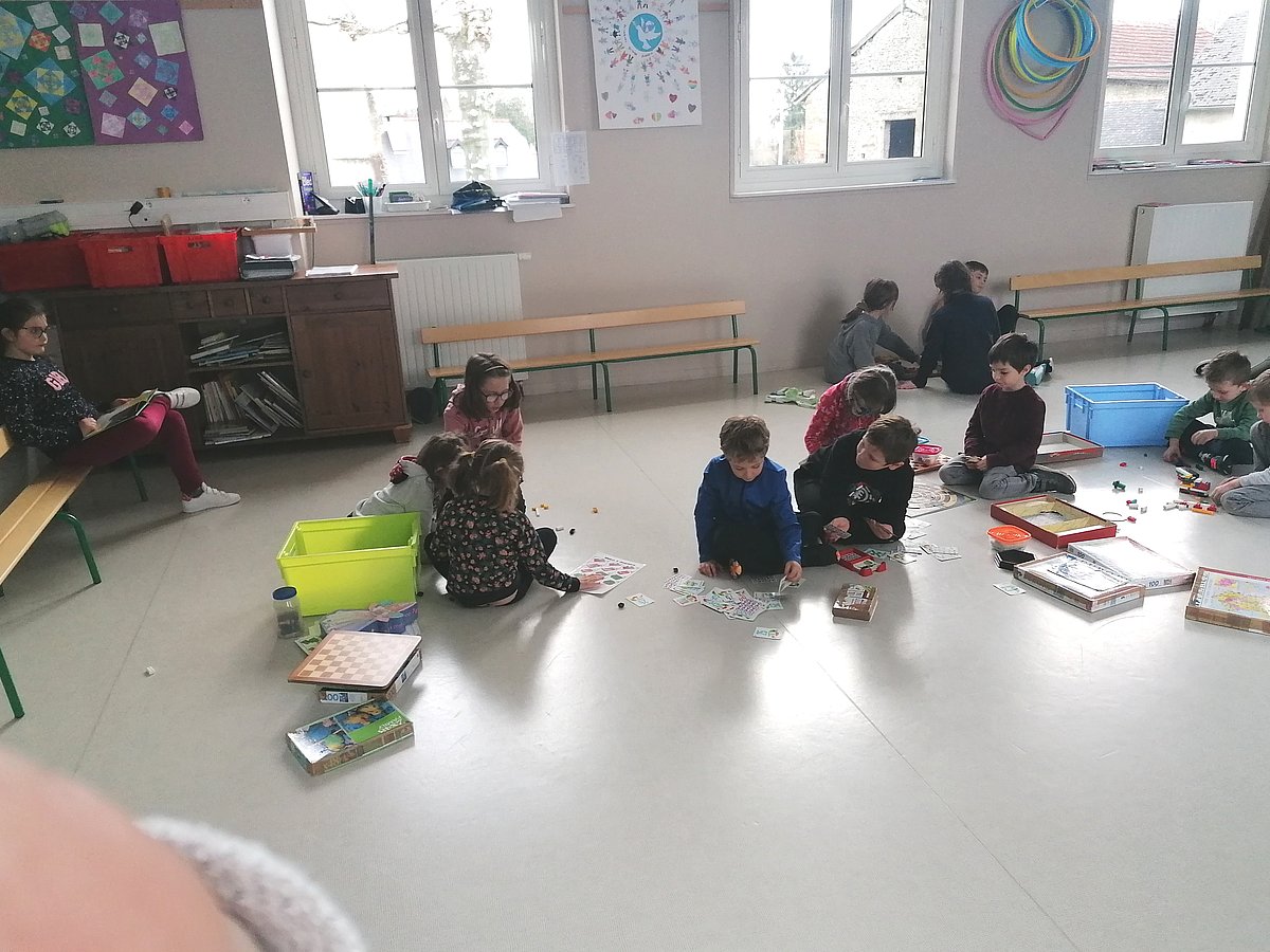 Des jeux et de nombreux livres sont mis à disposition des enfants dans la salle de motricité qui sert de salle de garderie.