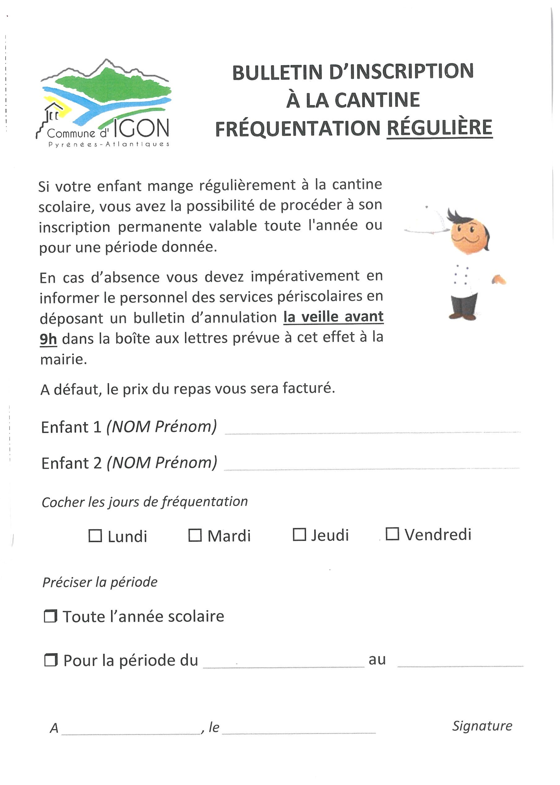 Les familles ont la possibilité d’annuler la cantine, avec le bulletin téléchargeable ci-dessus et doit impérativement le déposer dans la boîte aux lettres de la mairie prévue à cet effet, la veille jusqu’à 9h le lendemain matin. (bulletin à disposition également à la mairie)