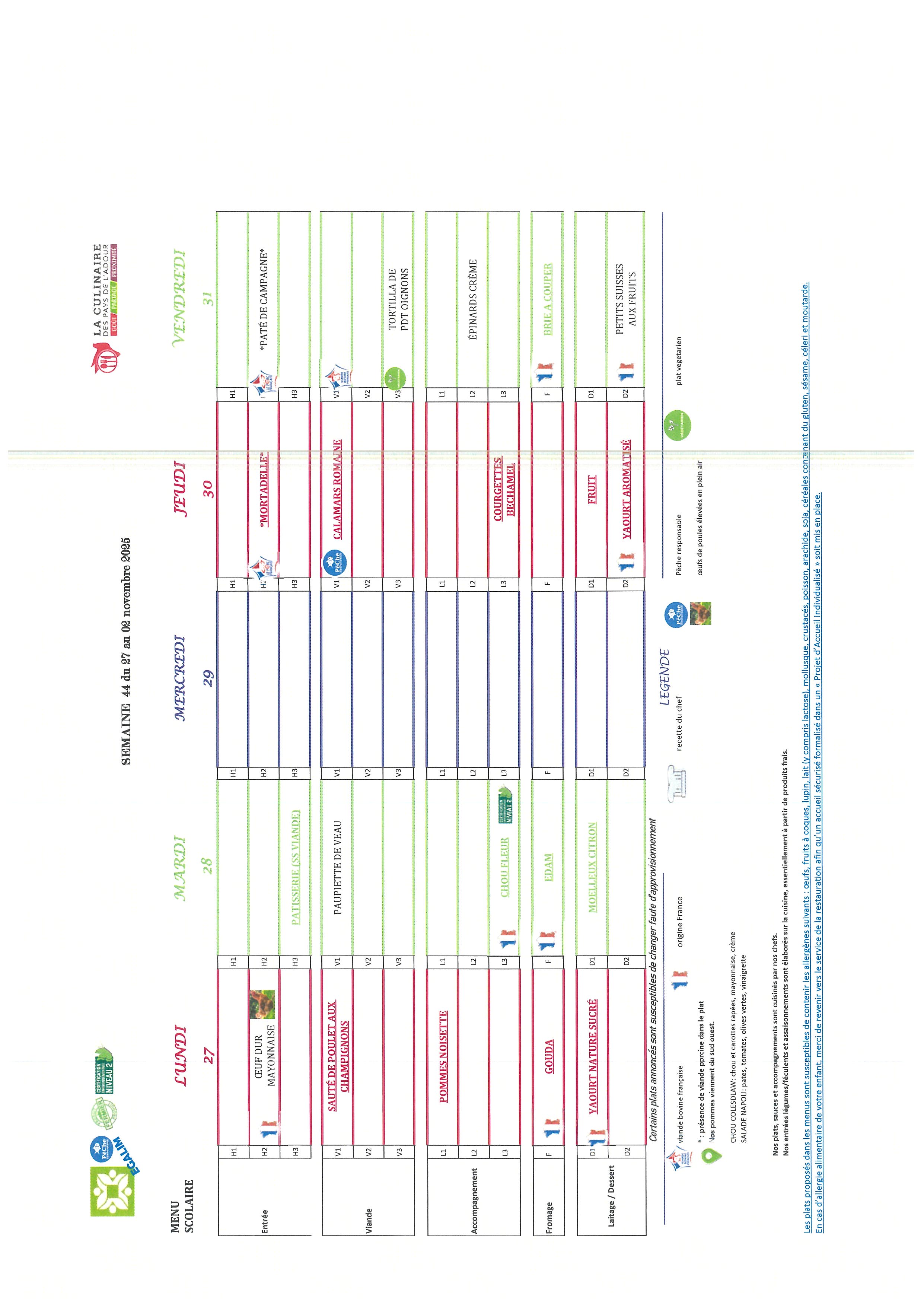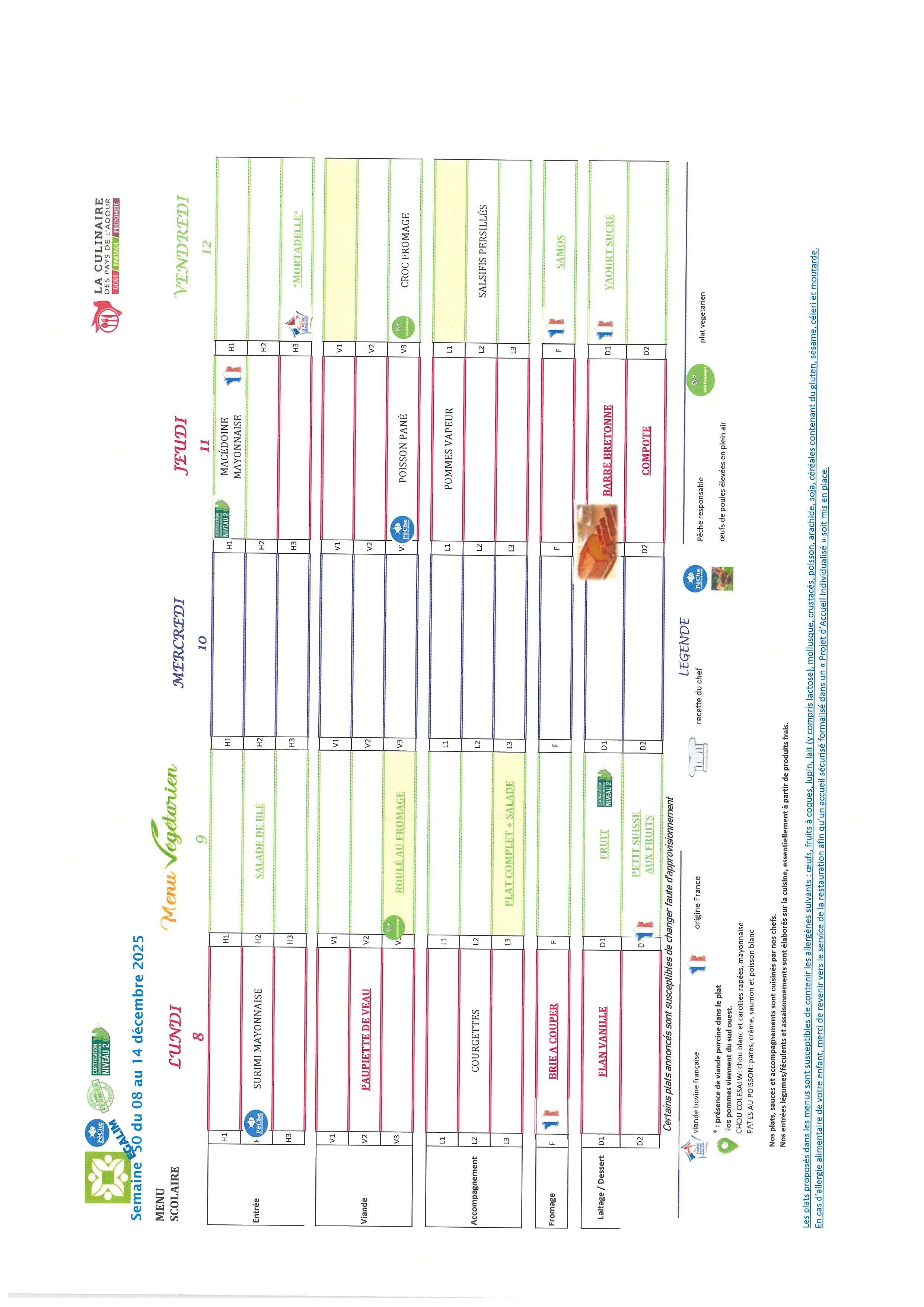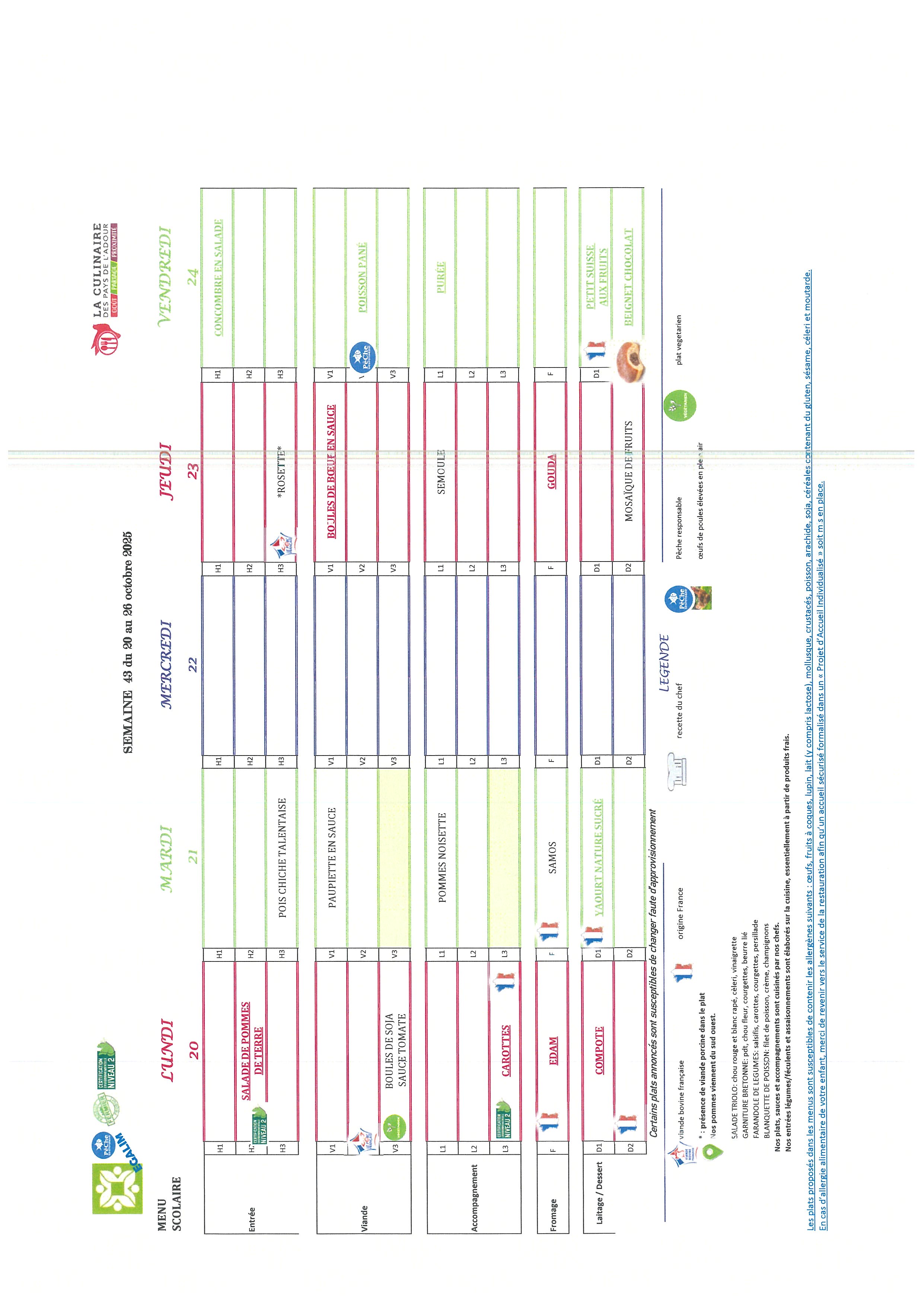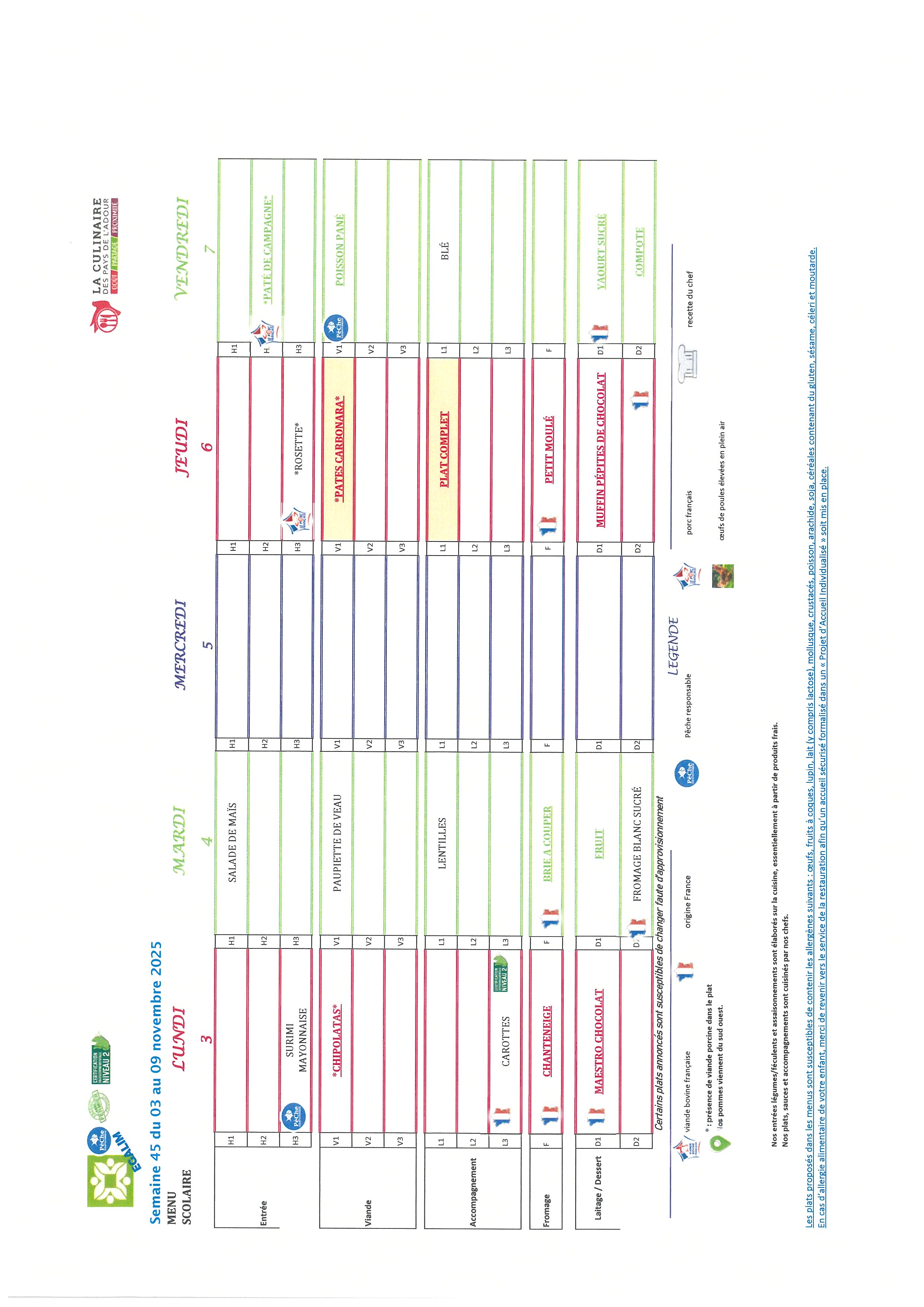 Les repas préparés en liaison froide, sont acheminés dans des camions frigorifiques chaque matin par notre prestataire « La culinaire » situé dans les Landes.