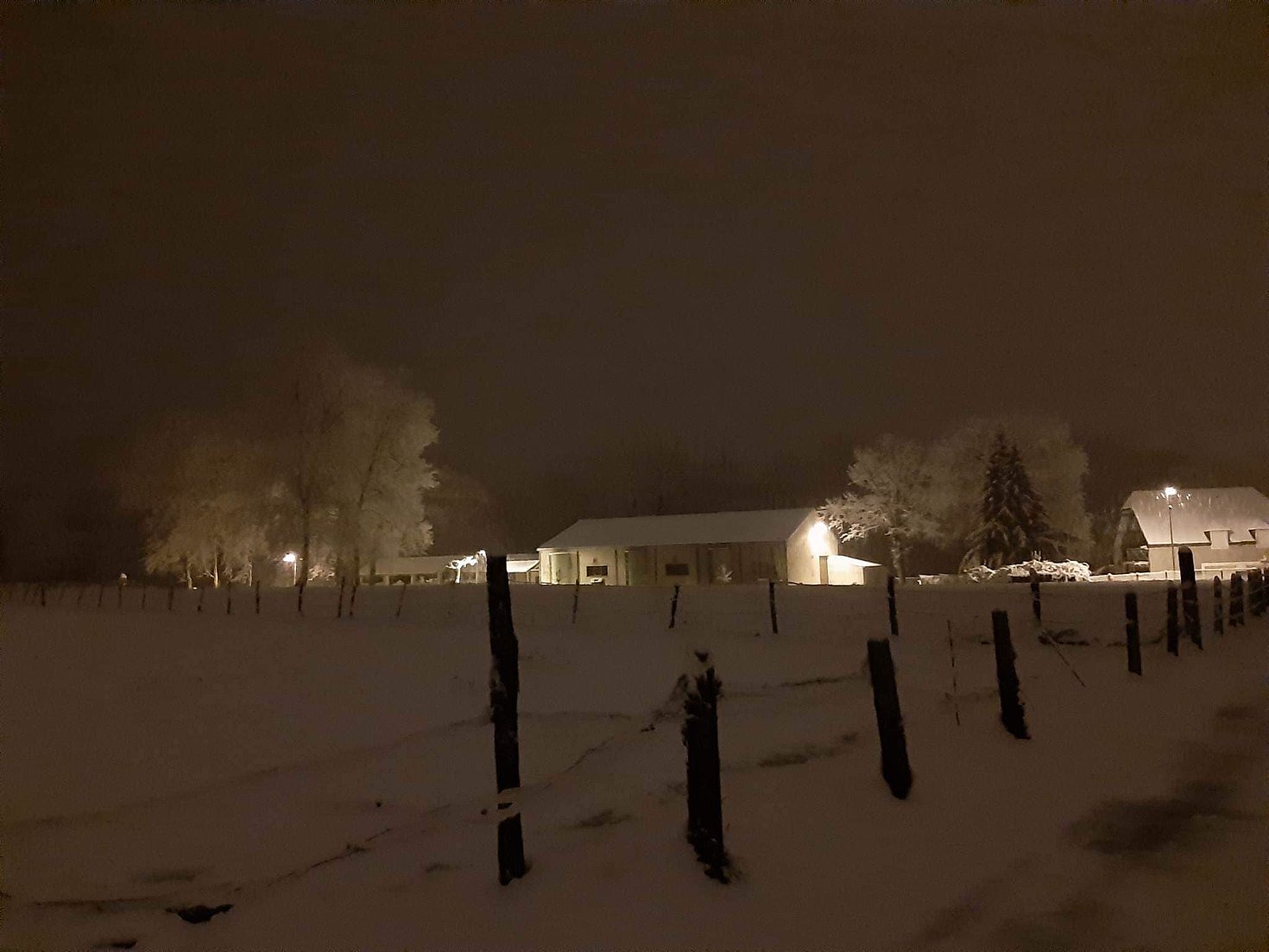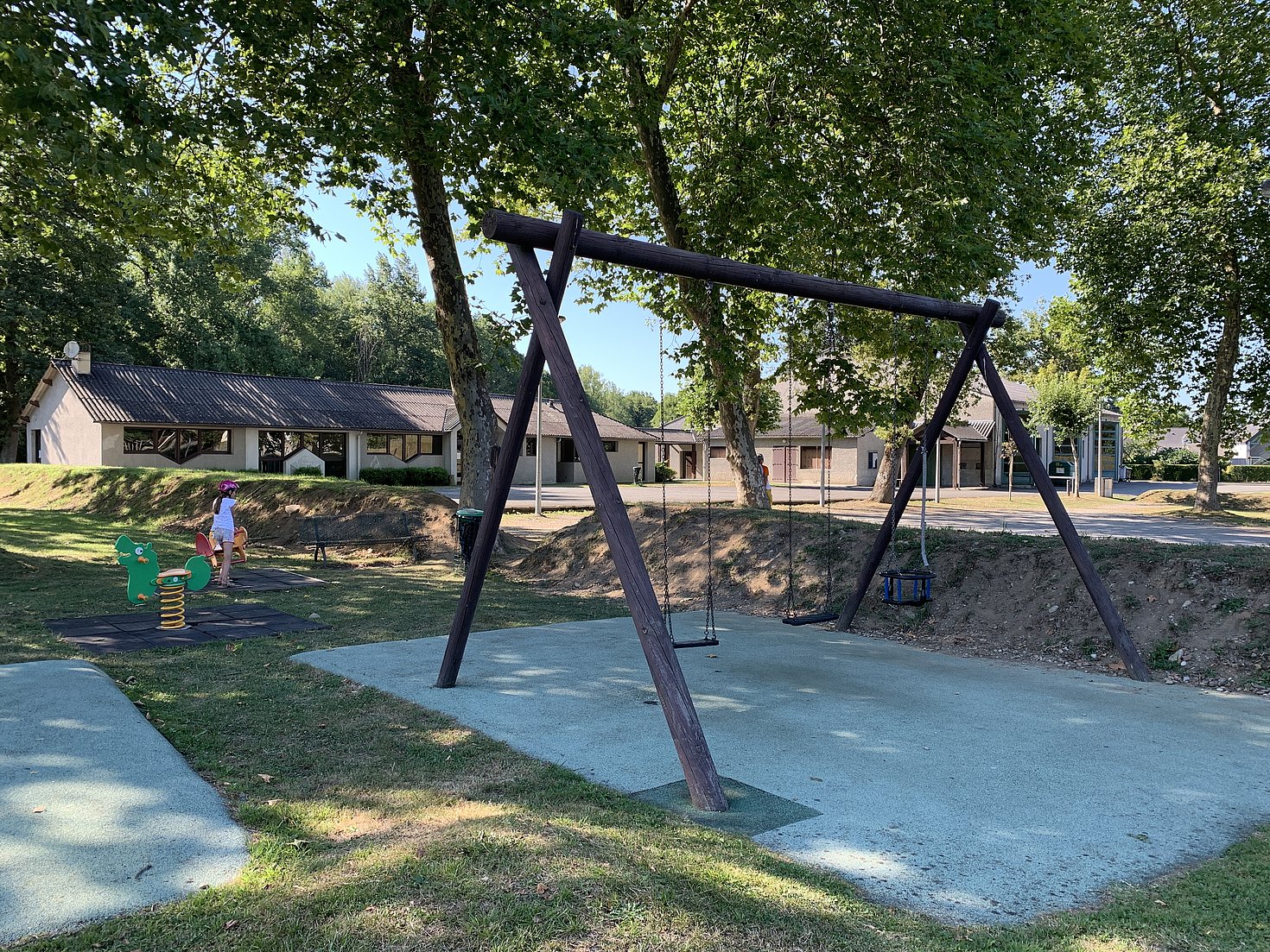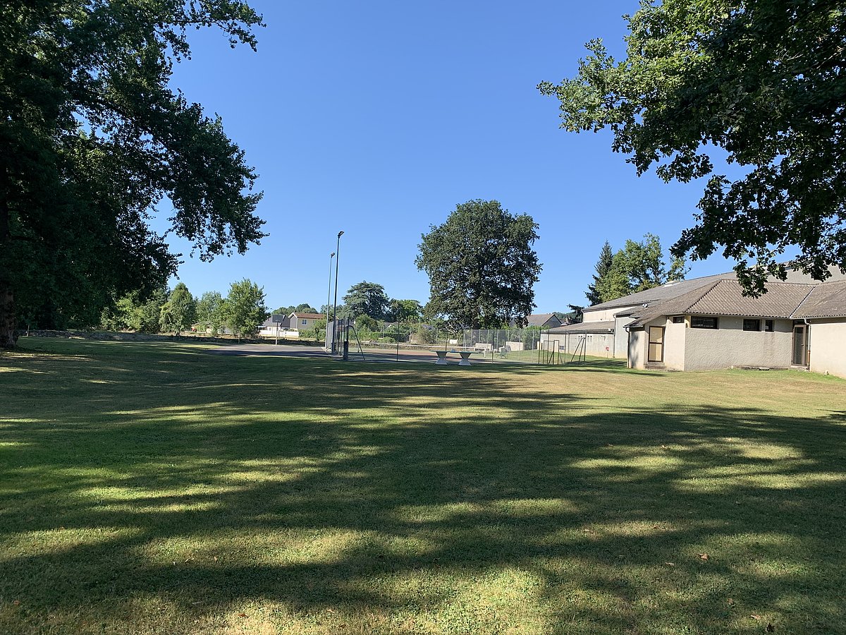 Prairie, le court de tennis et la table de ping pong à l'arrière de la salle des fêtes