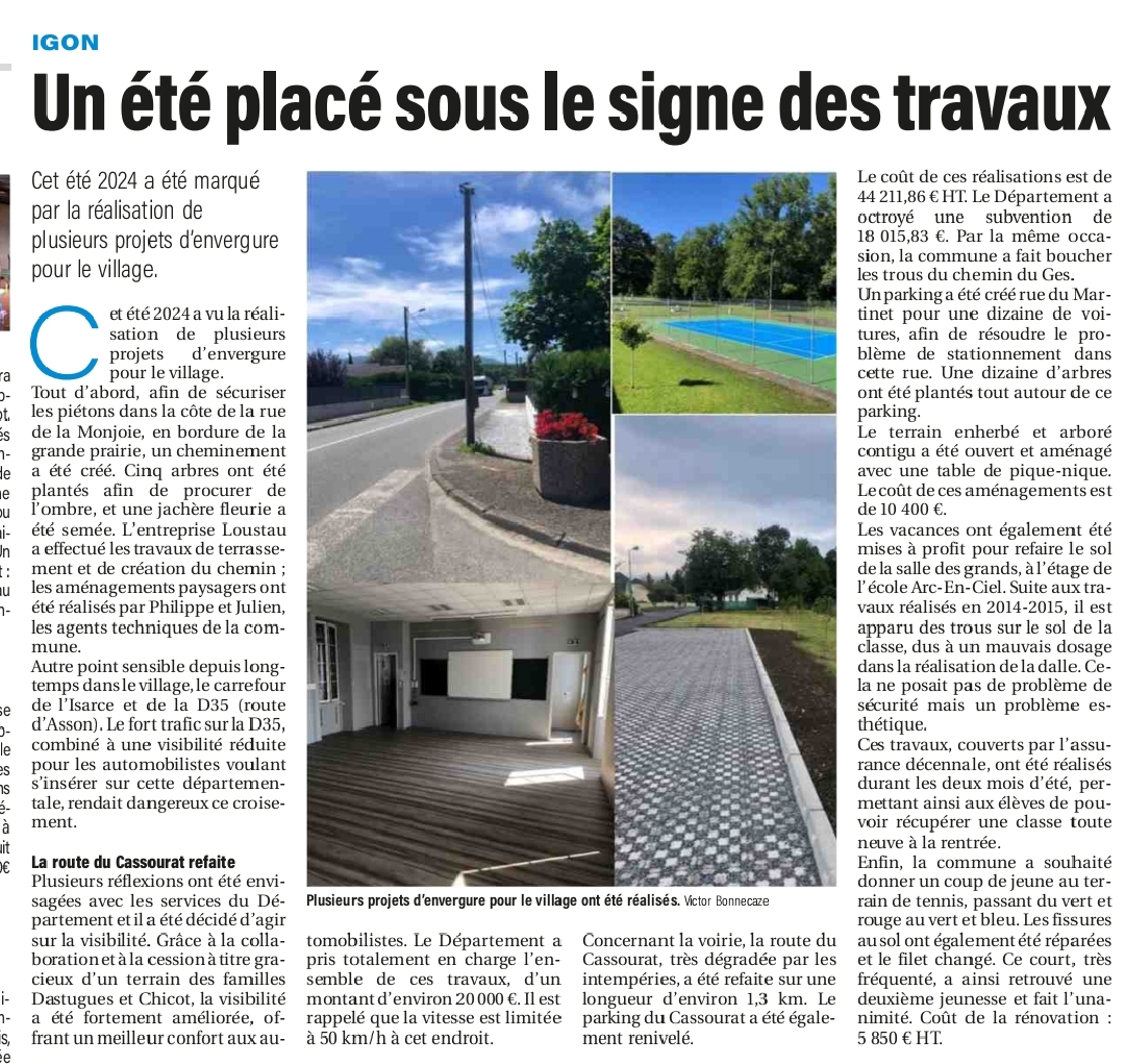 - Blow Patcher (rebouchage de trous) sur quelques rues du village : Impasse de l'Isarce, Rue de l'Isarce, Rue des Pyrénées, Rue du Général de Gaulle, Rue de la Monjoie