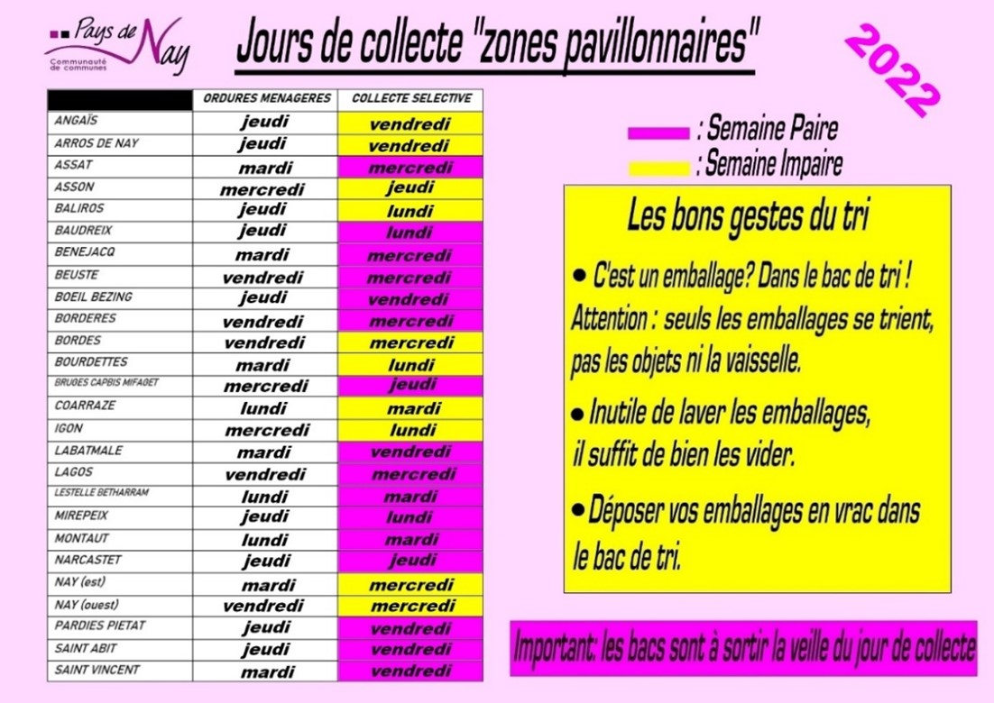 Le ramassage des déchets à recycler (bac couvercle jaune) s’effectue le lundi matin tous les 15 jours en semaine impaire en 2022. Le bac est à sortir la veille au soir.