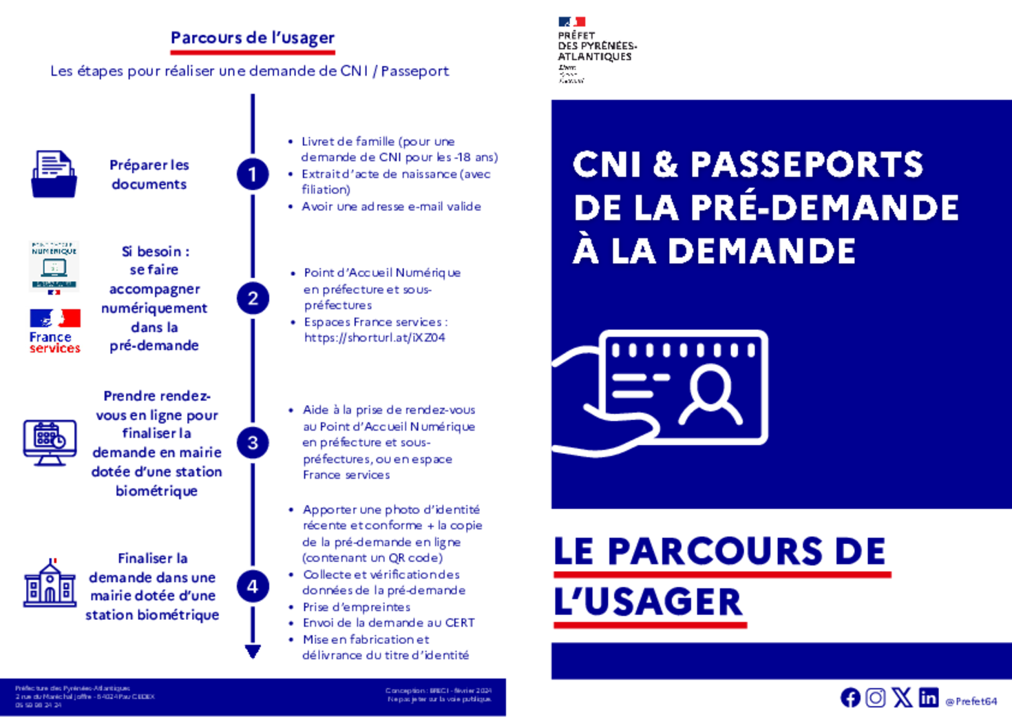 Depuis le 15 mars 2017, les demandes de délivrance des CNI doivent être effectuées dans l’une des 29 communes équipées d’un dispositif de recueil numérique des empreintes digitales dans les Pyrénées-Atlantiques ou dans tout autre commune équipée du dispositif de recueil numérique, même hors du département.
